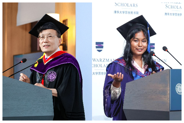 苏世民书院学术副院长钱小军宣读荣获2024年北京市优秀毕业生、清华大学优秀毕业生、校级优秀论文和院级优秀论文的获奖名单。为表彰学者们在过去一年里为社群或全球作出的贡献,书院特别设置“服务奖”(Recognition of Service Awards)。苏世民书院学生生活副院长孟启扬(Raphael Moffett)宣读“苏世民学者社群服务奖”及“全球服务奖”获奖名单。潘庆中表示,第8届苏世民学者在入学时被赋予了“无限的可能∞”,他用“好奇心一代” “同情心一代”“冠军一代”来形容这一届苏世民学者,并祝福大家毕业快乐。学生代表沈灵越(Samata Shrestha)深情地回顾了这段充满学习、友谊、实践和无限机会的旅程,并期待与第8届苏世民学者一道,从书院出发,心存感恩,让世界变得更好。