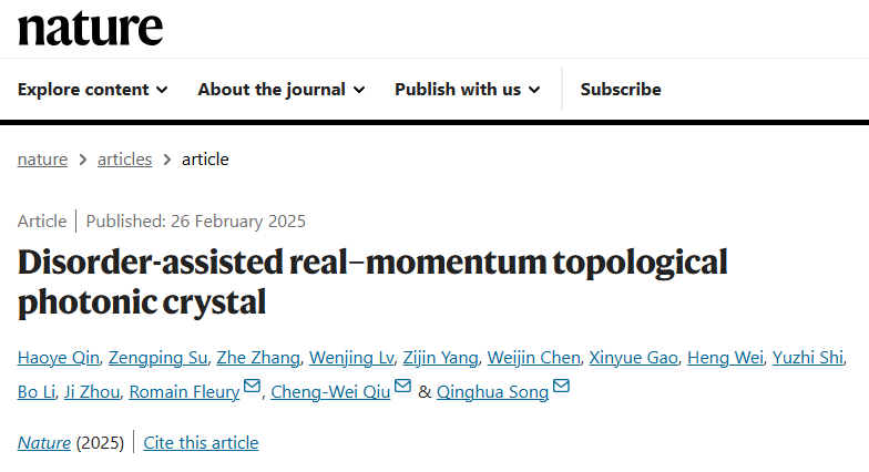 《自然》文章“无序辅助的实动量拓扑光子晶体”通讯作者为宋清华、仇成伟、罗曼·弗勒里,第一作者为秦昊烨,共同第一作者为清华大学深圳国际研究生院2022级博士生苏增平和洛桑联邦理工大学博士后张哲,其他作者还包括周济院士、李勃研究员,清华大学深圳国际研究生院2024级博士生吕文静、2022级博士生杨子矜、2022级硕士生高心越,新加坡国立大学陈伟锦博士后和卫珩博士,同济大学施宇智教授。该工作得到了国家自然科学基金委、深圳市科创委等部门支持。