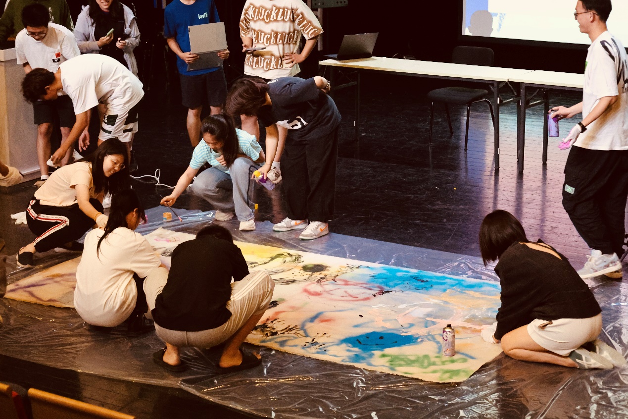 这样的碰撞与互动还有很多。为了给同学们创造更多实践交流的机会,罗薇特别设计了课程展示环节,将课堂搬到蒙楼多功能厅。课堂展示的设计初衷是为了鼓励学生打破学科壁垒,勇敢地去探索音乐表达的更多可能性。每学期的课堂展示内容都会给罗薇带来很多感动与惊喜,比如学生会用基于现场表演的实时影像与延时技术,去探索音乐与时间、空间的关系;用钢琴、打击乐和默剧表演去反思网络暴力对于生命个体的伤害;用光影与音效来审视自闭症患者敏感但却异常丰富的内心世界 ;借助AI技术将全班同学现场涂鸦完成的集体画作谱写成一首音乐作品等。