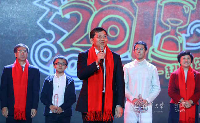 2017年12月31日晚,2018年清华大学新年联欢晚会在综合体育馆举行。在新年钟声即将敲响之际,校长邱勇发表了新年贺词。