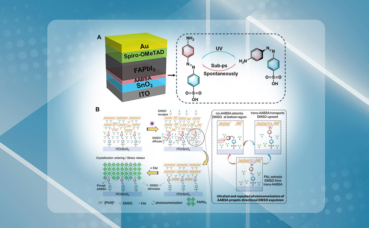 近日,清华大学材料学院林红教授团队合作在钙钛矿太阳能电池埋底界面二甲基亚砜(DMSO)残留去除方面取得重要研究进展。该团队创新性地提出了一种光响应分子工程策略,将具有光异构化特性的4'-氨基偶氮苯-4-磺酸(AABSA)分子引入SnO₂/钙钛矿埋底界面。在...