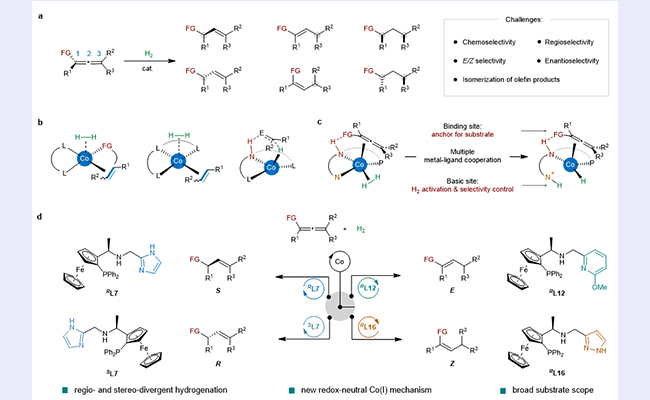 近日,清华大学化学系刘强教授课题组在不对称氢化研究领域取得重要突破。研究团队通过设计并合成一类具有多重金属-配体协同作用的新型钳形钴催化剂,成功实现了多取代联烯的位点与立体选择性发散式半氢化反应,解决了该领域长期存在的选择性控制难题。