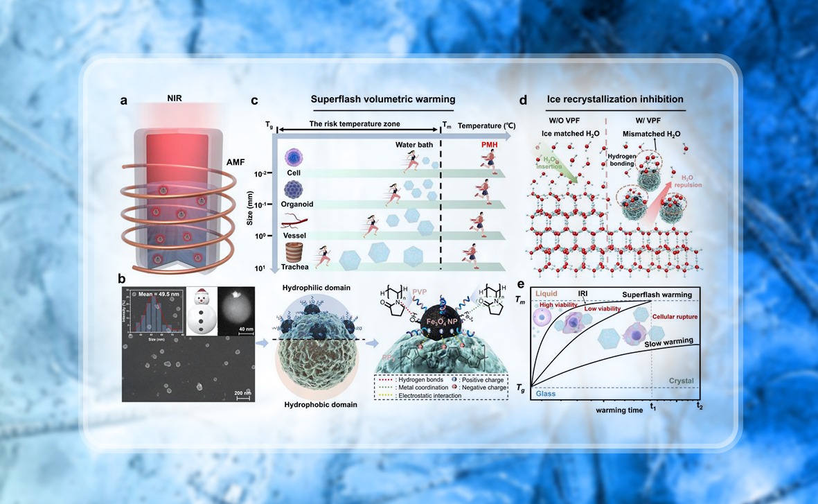 清华大学深圳国际研究生院耿洪亚助理教授团队在前期研究抗冻多肽和抑冰-光热纳米冻存剂的基础上,设计了一种具有雪人状结构的Janus纳米杂化材料(VPF),从“抑冰-升温”两条主线同步展开,通过结构设计、界面调控与能量耦合策略,实现了在微观与宏观尺度...
