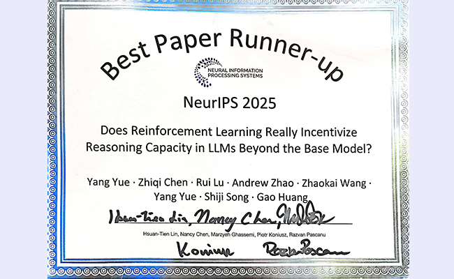 12月6日,在美国圣地亚哥举行的第39届神经信息处理系统会议上,清华大学自动化系宋士吉教授、黄高副教授团队的论文“强化学习是否真的能激发大语言模型产生超越基础模型的推理能力?”获得最佳论文亚军奖。