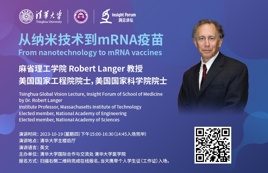 邀请麻省理工学院Robert Langer教授,做客清华海外名师讲堂和清华大学医学院洞见讲坛,分享他的学术生涯和在mRNA疫苗研发方面的体会。